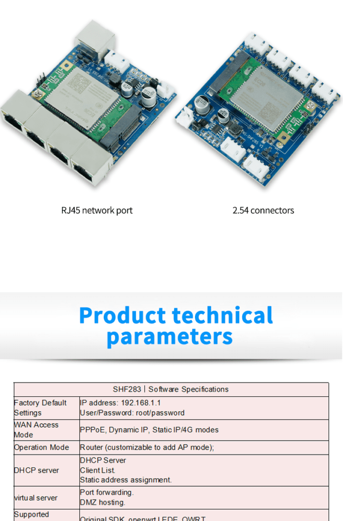 SHF285 is a 4G mini router motherboard. Utilizing the MT7628 mainframe, the SHF283 delivers superior wireless rates and signal strength. This new router provides high data transmission for gateway data, voice and image applications in the smart home, while consuming far less power than other similar products on the market. The portable and compact design also meets the need for travel-optimized networks.